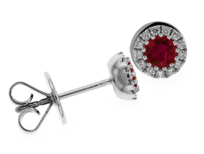 This fabulous purplish red ruby earring is made especially from Carnation Designs Signature. It features one round shaped cut the most radiant red ruby at center that is surrounding by small round cut brilliant diamonds pave set in 18k white gold. It can be worn at any time with perfect match for any wardrobe.