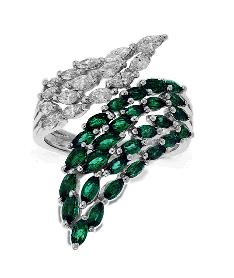 This Carnation Designs’ Signature ring features three rows of alternating small round-cut brilliant diamonds and a collection of marquise shaped cut vivid emerald four rows. This ring sets a frame of pave-set precious stones in18k white gold band that will show your stylish design. It will bring you to wear any wardrobe at any time.