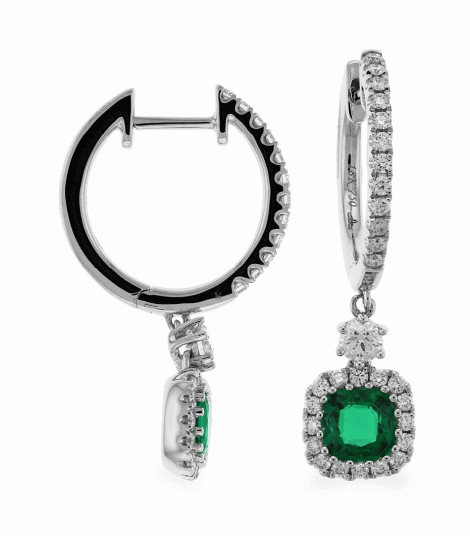 This stunning lush green emerald earring is made amazingly from Carnation Designs Signature. It features one cushion shaped cut vivid green emerald in center that is surrounded by small round-cut brilliant diamonds pave set in 18k white gold. It can wear at any time with any wardrobe. It will bring your excellent gift!!!