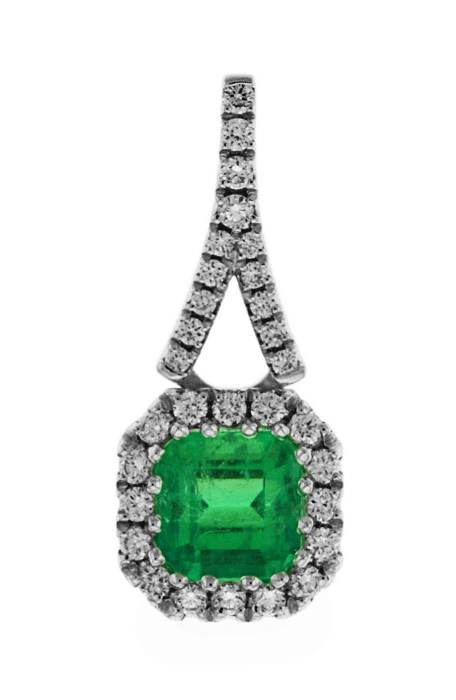 This fabulous vivid green emerald pendent is made worthily from Carnation Designs Signature. It features one emerald cut the most radiant green emerald that is surrounding by small round cut brilliant diamonds, dropped down from top with beautiful shaped brilliant small round cut diamonds row pave set in 18k white gold. It will bring you to wear at any time with any wardrobe forever!!!