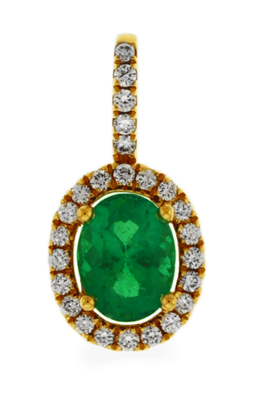This Carnation Designs Signature pendant features lush green oval shaped cut emerald. You will see the quality of its rich green color and high brilliance. It is surrounded by small brilliant round cut diamonds in 18k yellow gold. It will bring you to wear at any time with any wardrobe for your unique style.