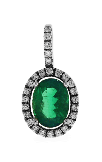 This Carnation Designs Signature pendant features lush green oval shaped cut emerald. You will see the quality of its rich green color and high brilliance. It is surrounded by small brilliant round cut diamonds in 18k white gold. It will bring you to wear at any time with any wardrobe for your unique style.