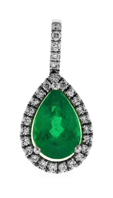 This Carnation Designs Signature pendant features pear shaped cut lush green emerald. You will see the quality of its rich green color and high brilliance. It is surrounded by small brilliant round cut diamonds in 18k white gold. It will bring you to wear at any time with any wardrobe for your unique style.