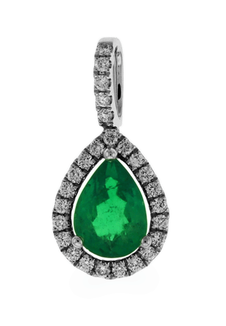 This Carnation Designs Signature pendant features pear shaped cut lush green emerald. You will see the quality of its rich green color and high brilliance. It is surrounded by small brilliant round cut diamonds in 18k white gold. It will bring you to wear at any time with any wardrobe for your unique style.