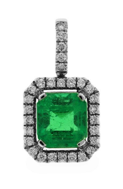 Carnation Designs Signature pendent features one emerald shaped lush green emerald is hanging from the top a collection of small brilliant diamonds row and surrounded by round cut brilliant diamonds in 18k white gold. This fascinating vivid green emerald pendant will bring you to wear at any time with any wardrobe for your unique style.