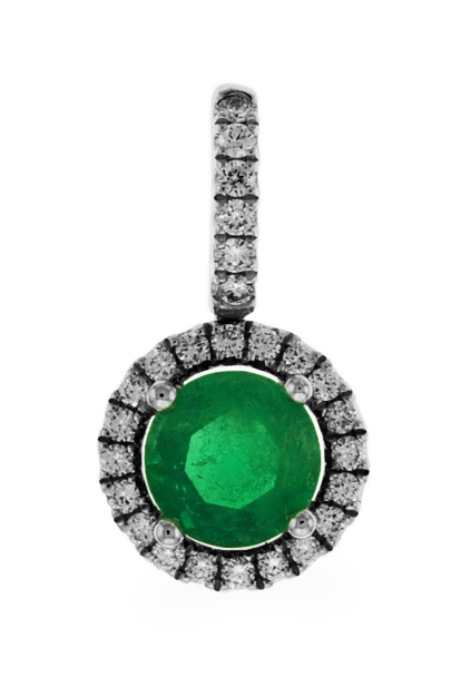 This Carnation Designs Signature pendant features lush green round shaped cut emerald. You will see the quality of its rich green color and high brilliance. It is surrounded by small brilliant round cut diamonds in 18k white gold. It will bring you to wear at any time with any wardrobe for your unique style.