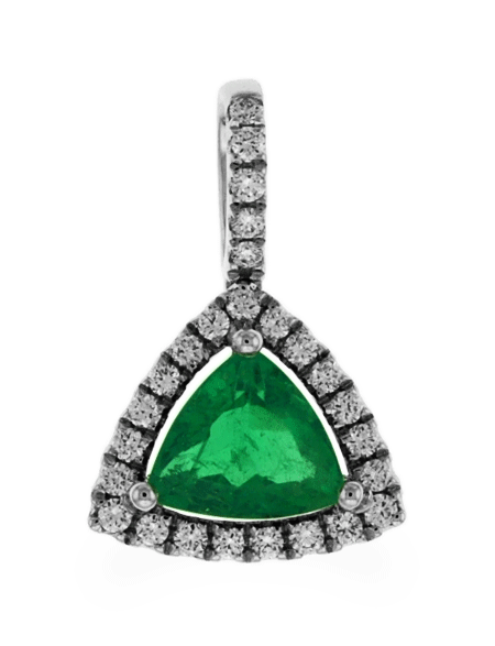 This Carnation Designs Signature pendant features lush green trillion shaped cut emerald. You will see the quality of its rich green color and high brilliance. It is surrounded by small brilliant round cut diamonds in 18k white gold. It will bring you to wear at any time with any wardrobe for your unique style.