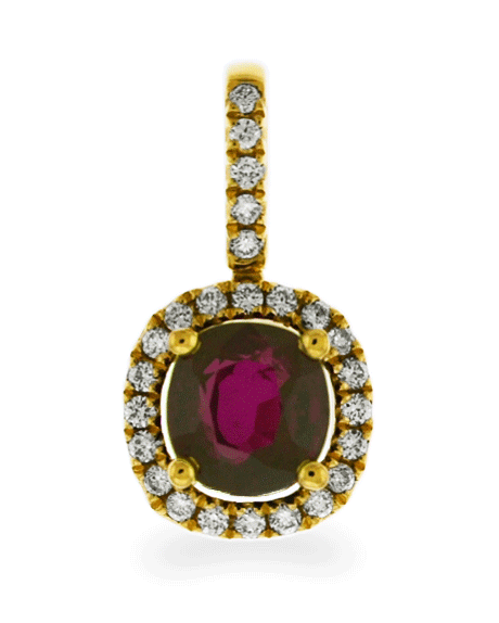 This Carnation Designs Signature pendant features purplish red cushion shaped cut ruby that is surrounded by small round cut brilliant diamonds in 18k yellow gold. You will see the quality of its rich red color and high brilliance. It will bring you to wear at any time with any wardrobe for your unique style.
