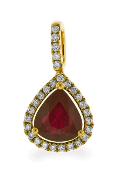 This Carnation Designs Signature pendant features purplish red pear-shaped cut ruby that is surrounded by small round cut brilliant diamonds in 18k yellow gold. You will see the quality of its rich red color and high brilliance. It will bring you to wear at any time with any wardrobe for your unique style.