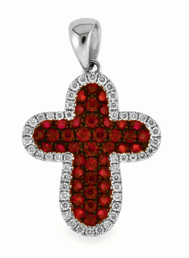 This stunning purplish red rubies and brilliant diamonds pendent is made beautifully from Carnation Designs Signature. It features small round shaped cut the most radiant red rubies that are surrounding by small round cut brilliant diamonds as a beautiful design pave set in 18k white gold. It can be worn at any time with perfect match for any wardrobe.