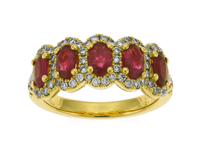 This Carnation Designs Signature ring features a collection of same quality of five oval shaped cut purplish red rubies at center and surrounded by same quality of brilliant small round cut diamonds pave set in 18k yellow gold. It can wear for you perfectly at any time with any wardrobe forever!!!