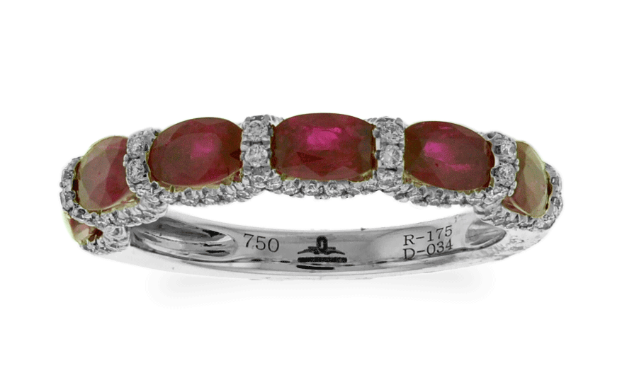 This stunning ring features oval cut the deep purplish red rubies accented with small brilliant diamonds by pave set on 18k white gold. This stylish Carnation Designs Signature ring looks elegant on your finger and it will bring you to wear at any time with any wardrobe.