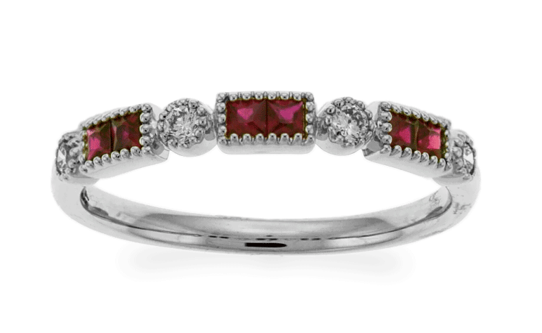 This classical style ring features a single row of alternating square shaped-cut two purplish red rubies and one small round cut brilliant diamond by accenting alternately. This ring sets a frame of pave-set precious stones going half-way around in 18k white gold band and Carnation Designs Signature is on its shank. You will love it your treasure forever!!!