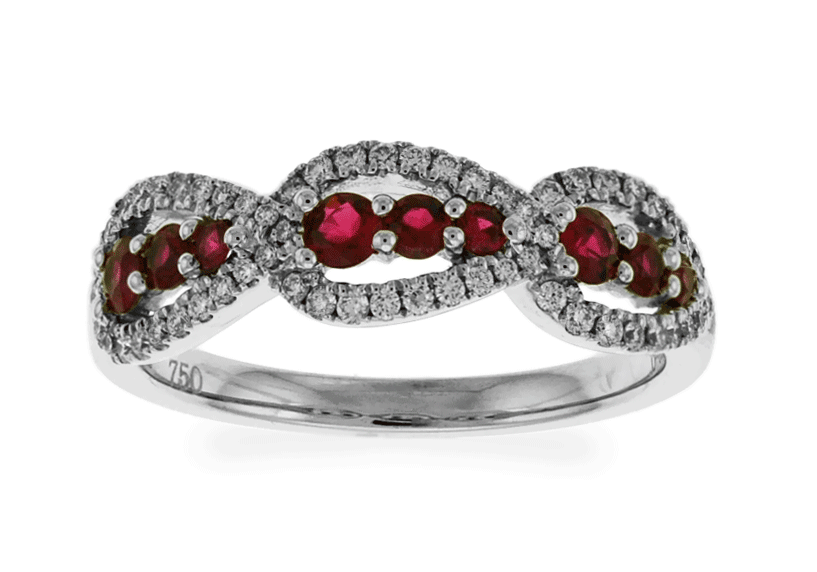 This Carnation Designs Signature ring features the same quality of nine small round shaped cut purplish red rubies accented by brilliant small round cut diamonds row on each side as an attractive design in 18k white gold. You will love to wear it at any time with any wardrobe for your elegant style forever!!!!
