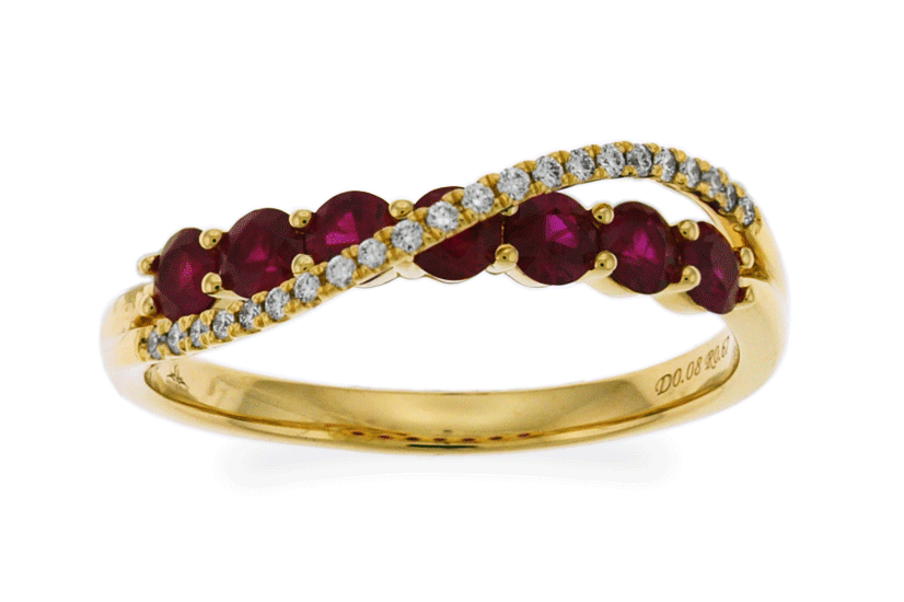 This Carnation Designs Signature ring features one row of vivid red rubies and one row of brilliant diamonds set as an attractive twisted shaped design in 18k yellow gold. It will show your sophisticated style and you can wear it with any wardrobe at any time.