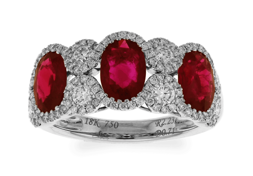 This Carnation Designs Signature ring features a collection of same quality of three oval shaped cut deep red rubies in center and surrounded by a beautiful design of brilliant small round cut diamonds pave set in 18k white gold. You can wear any wardrobe at any time and it will bring your treasure forever!!!