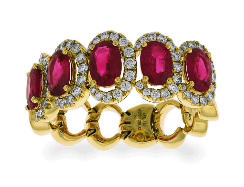 This Carnation Designs Signature ring features a collection of same quality of five oval shaped cut the most radiant purplish red rubies in center and surrounded by same quality of brilliant small round cut diamonds pave set in 18k yellow gold. It will bring you to wear perfectly at any time with any wardrobe forever!!!