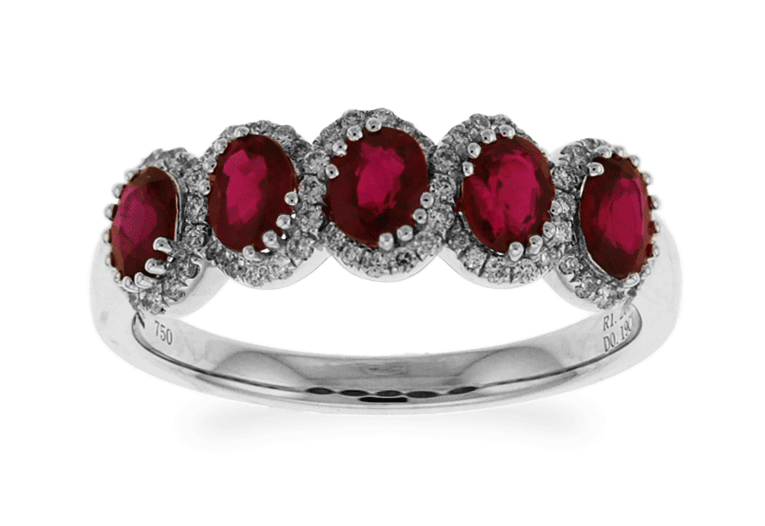 This stunning ring features a collection of same quality of five oval shaped cut purplish red rubies at center and surrounded by same quality of brilliant small round cut diamonds pave set in 18k white gold. It can wear for you perfectly at any time with any wardrobe forever!!!