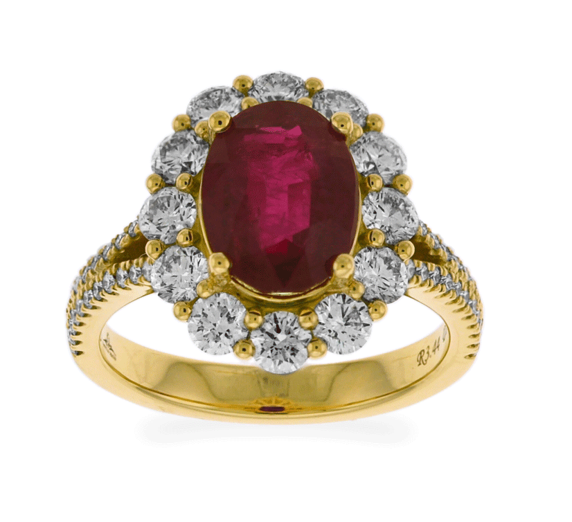 This gorgeous ring is made beautifully from Carnation Designs Signature. It features oval shaped cut purplish red ruby at center and the collection of same quality of small round cut brilliant diamonds pave set. This 18k yellow gold fashionable ring is for any wardrobe to add your loveliness and you will love to wear it forever!!!