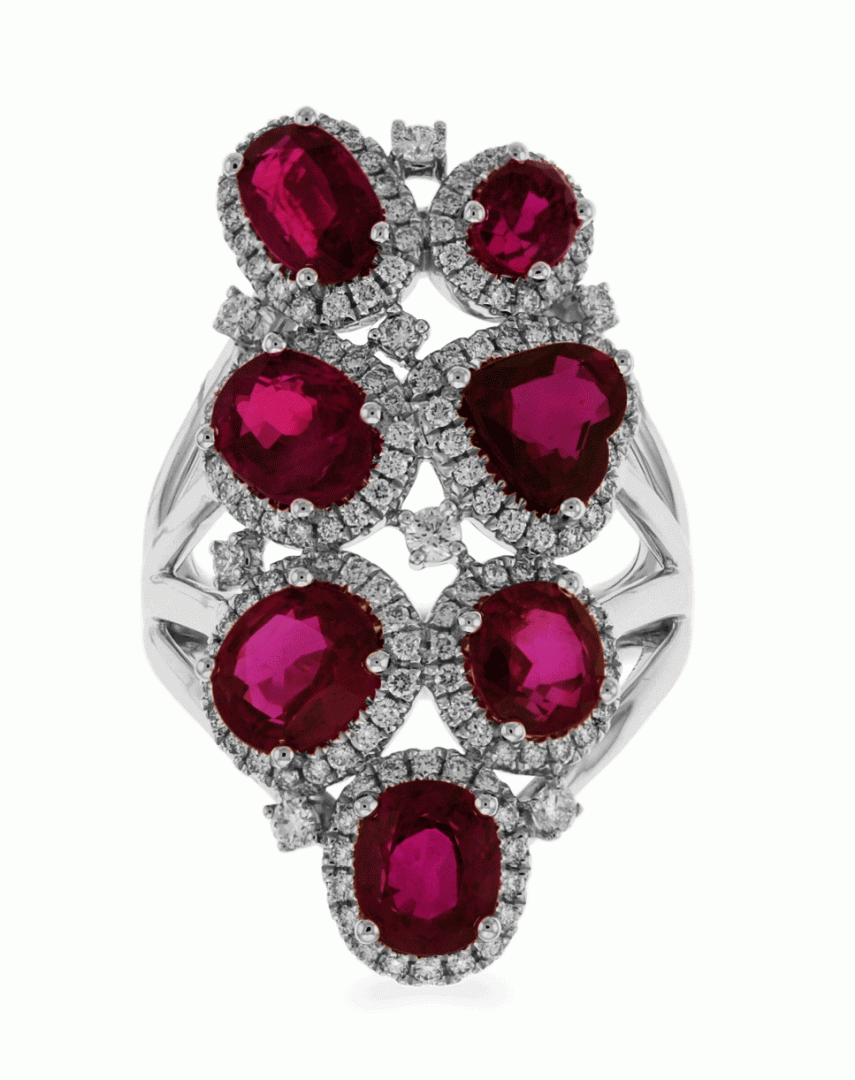 This stunning Carnation- Designs ring features a collection of variety cuts the most radiant red rubies pave set attached between each ruby with one shining diamond and surrounding by brilliant diamonds in 18k white gold band. This ring will bring your elegant style and you can see its signature on its shank.