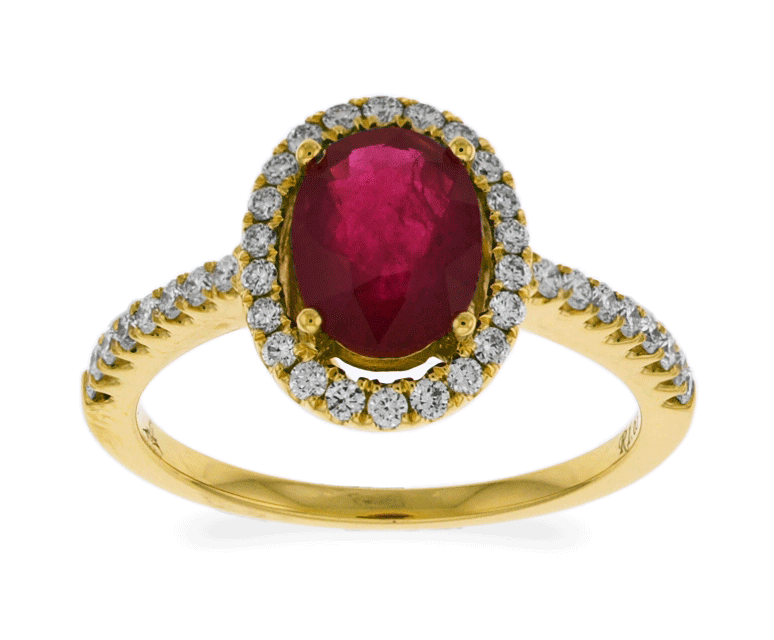 This fabulous solitaire ring features the most radiant red oval shaped cut ruby at center enclosed with small round cut brilliant diamonds pave-set in 18k yellow gold. This ring is proficiently created by Carnation Designs and its Signature is on its shank. It will bring you to wear at any time with any wardrobe for your unique style.