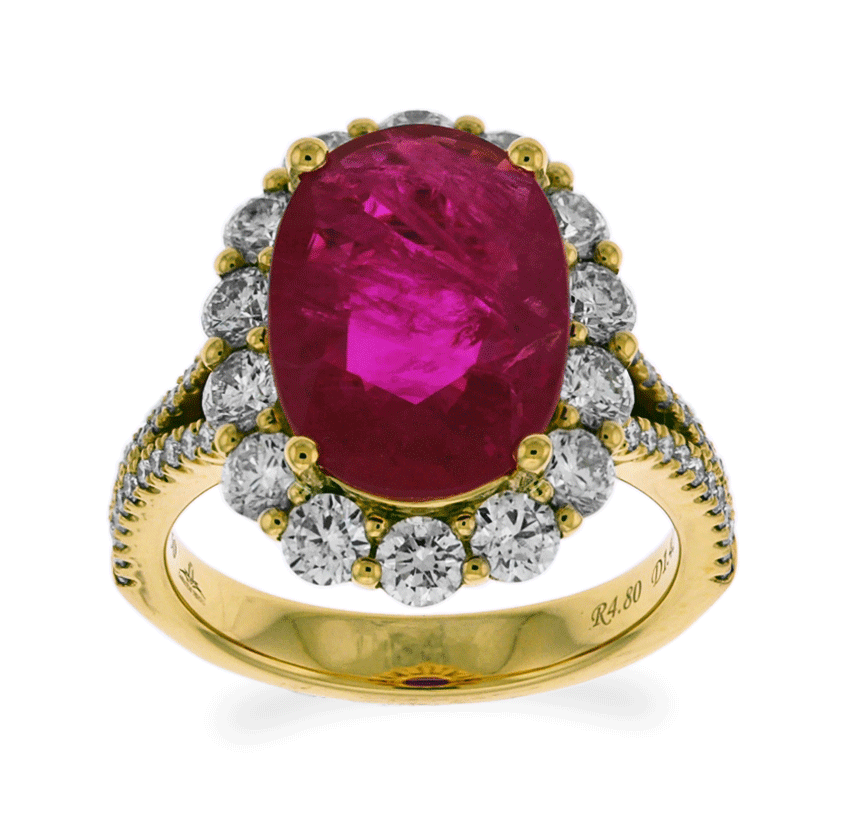 This gorgeous ring is made beautifully from Carnation Designs Signature. It features oval shaped cut purplish red ruby at center and the collection of same quality of small round cut brilliant diamonds pave set. This 18k yellow gold fashionable ring is for any wardrobe to add your loveliness and you will love to wear it forever!!!