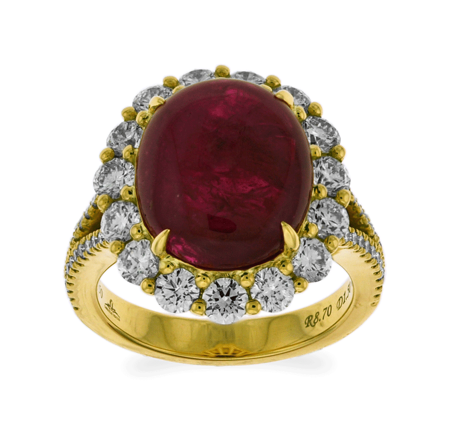 This gorgeous ring is made beautifully from Carnation Designs Signature. It features oval shaped cut purplish red cabochon ruby at center and the collection of same quality of small round cut brilliant diamonds pave set. This 18k yellow gold fashionable ring is for any wardrobe to add your loveliness and you will love to wear it forever!!!