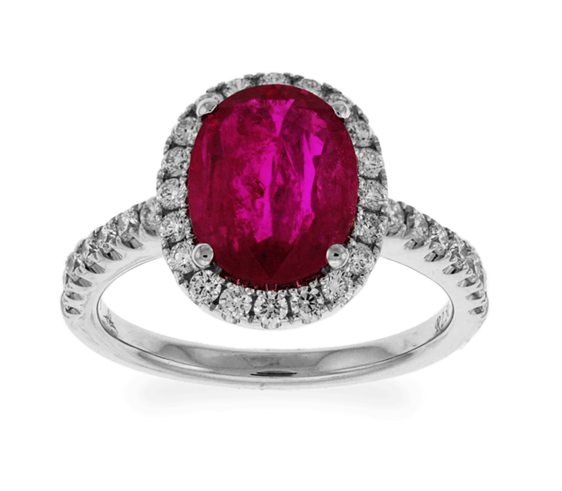 This fabulous solitaire ring features the most radiant red oval shaped cut ruby at center enclosed with small round cut brilliant diamonds pave-set in 18k white gold. This ring is proficiently created by Carnation Designs and its Signature is on its shank. It will bring you to wear at any time with any wardrobe for your unique style.