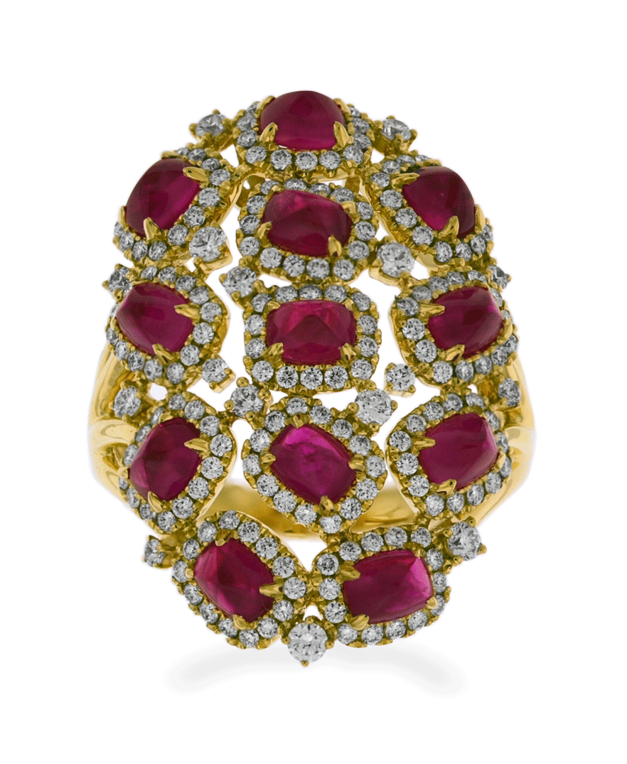 This stunning Carnation- Designs ring features a collection of sugar load shaped cut rubies pave set attached between each ruby with one shining diamond and surrounding by brilliant diamonds in 18k yellow gold band. This ring will bring your elegant style and you can see its signature on its shank.