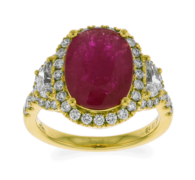 This stunning solitaire ring features purplish red oval shaped cut ruby at center and half-moon shaped cut brilliant diamonds enclosed with small brilliant round shaped cut diamonds pave-set in 18k yellow gold. This ring is proficiently created by Carnation Designs and its Signature is on its shank. It will bring you to wear perfectly at any time with any wardrobe and your treasure forever!!!