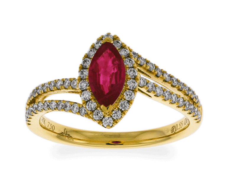 This fabulous ring features an elegant micro-pave set of brilliant diamonds and a lovely style of marquise shaped cut purplish red ruby in center. It is surrounded by small round cut brilliant diamonds in 18k yellow gold. This stunning ring is perfectly created by Carnation Designs and its Signature is on its shank.