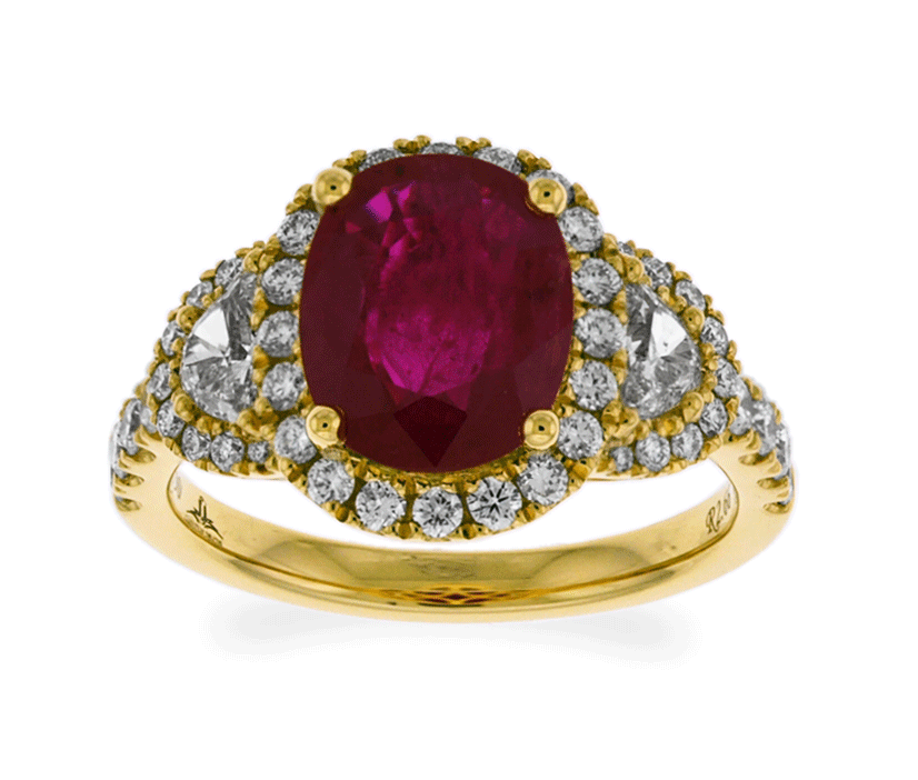 This gorgeous ring is made beautifully from Carnation Designs Signature. It features oval shaped cut the most radiant purplish red ruby at center and half-moon shaped cut brilliant diamonds enclosed with the collection of same quality of small round shaped cut brilliant diamonds pave set. This 18k yellow gold fashionable ring is for any wardrobe to add your loveliness and you will love to wear it forever!!!