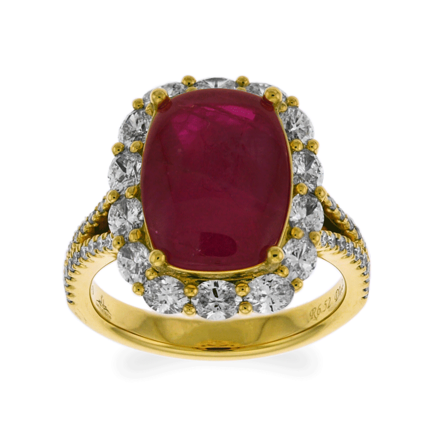 This gorgeous ring is made beautifully from Carnation Designs Signature. It features sugar shaped purplish red ruby at center and the collection of same quality of small oval shaped cut and round shaped cut brilliant diamonds pave set. This 18k yellow gold fashionable ring is for any wardrobe to add your loveliness and you will love to wear it forever!!!