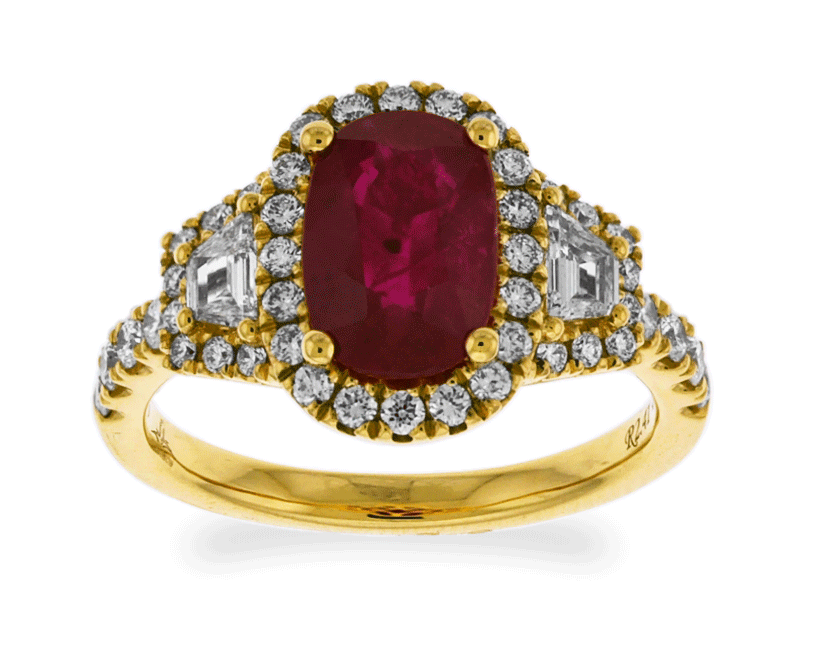 This gorgeous ring is made beautifully from Carnation Designs Signature. It features oval shaped cut the most radiant purplish red ruby at center and trapezoid shaped cut brilliant diamonds enclosed with the collection of same quality of small round shaped cut brilliant diamonds pave set. This 18k yellow gold fashionable ring is for any wardrobe to add your loveliness and you will love to wear it forever!!!