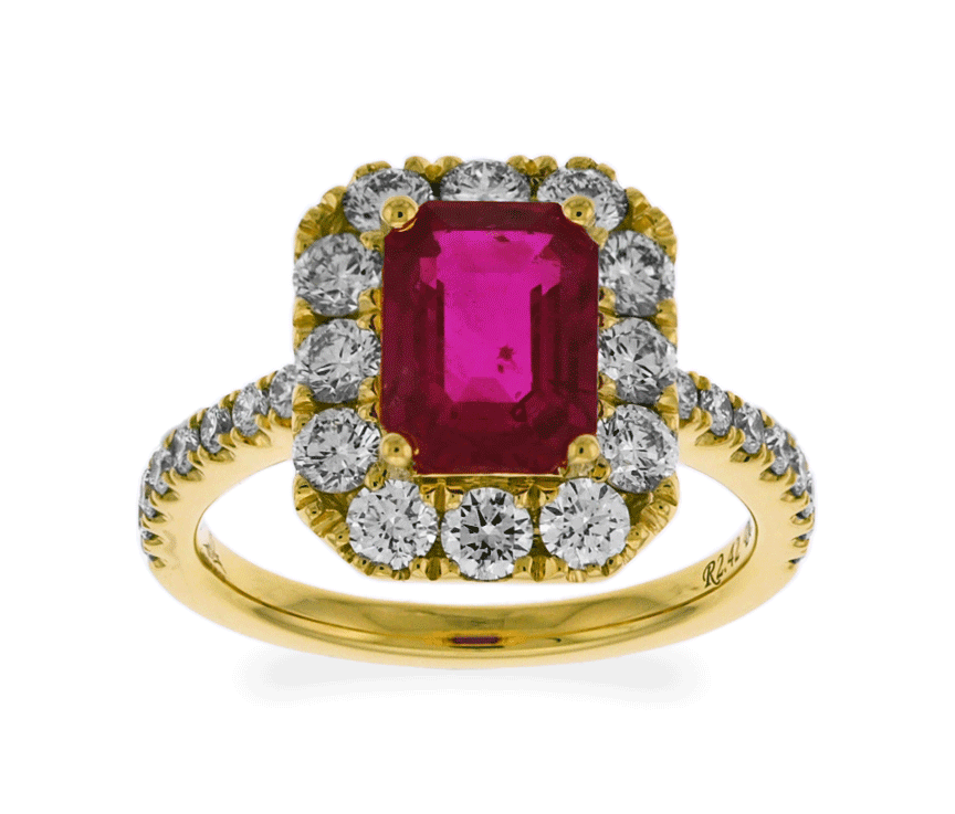 This fabulous solitaire ring features the most radiant red emerald cut ruby at center enclosed with small round cut brilliant diamonds pave-set in 18k yellow gold. This ring is proficiently created by Carnation Designs and its Signature is on its shank. It will bring you to wear at any time with any wardrobe for your unique style.