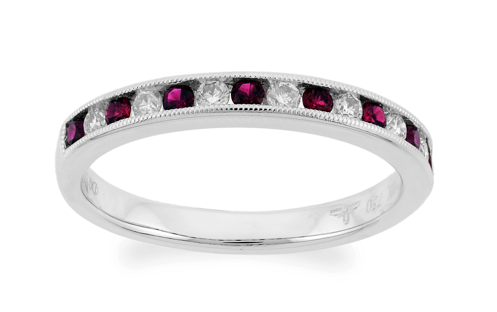 This classical style ring features a single row of one small round shaped cut purplish red ruby and one small round cut brilliant diamond by accenting alternately. This ring sets a frame of pave set precious stones going half-way around in 18k white gold band. Carnation Designs Signature is burnishing on its shank. You will love it your treasure forever!!!