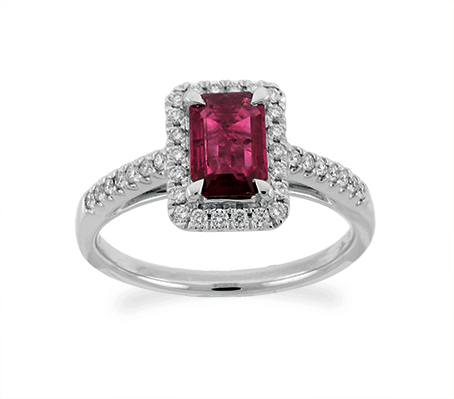 This fabulous solitaire ring features the most radiant red emerald shaped cut ruby at center enclosed with small round cut brilliant diamonds pave set in 18k white gold. This ring is proficiently created by Carnation Designs and its Signature is on its shank. It will bring you to wear at any time with any wardrobe for your unique style.