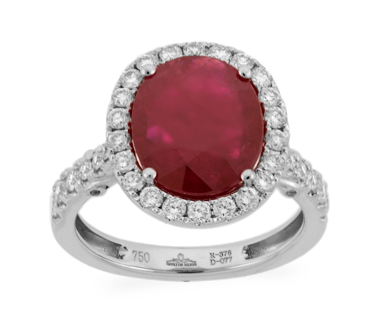 This fabulous solitaire ring features the most radiant red oval shaped cut ruby at center enclosed with small round cut brilliant diamonds pave set in 18k white gold. This ring is proficiently created by Carnation Designs and its Signature is on its shank. It will bring you to wear at any time with any wardrobe for your unique style.