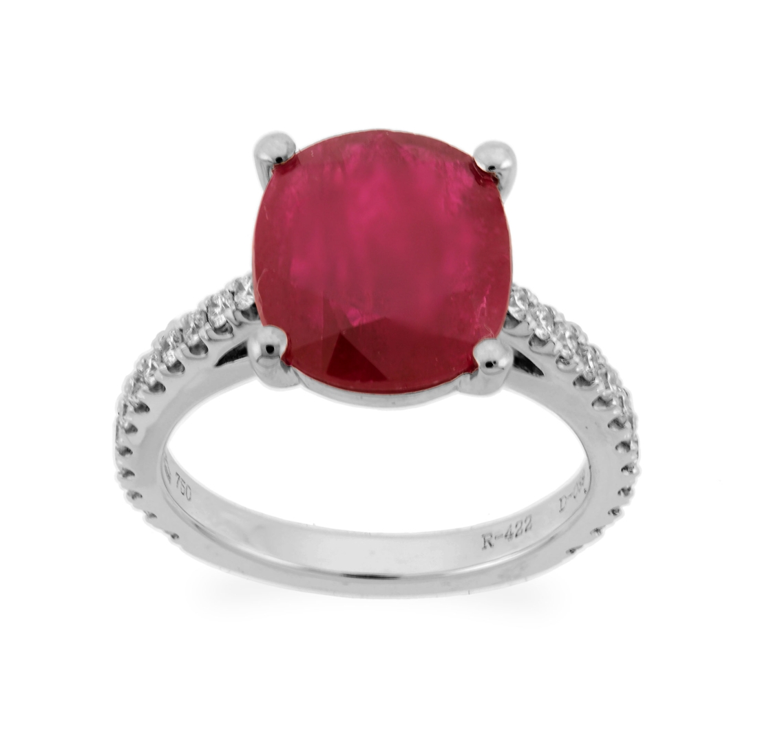 This gorgeous ring is made beautifully from Carnation Designs Signature. It features an oval shaped cut the most radiant purplish red ruby at center and small round shaped cut brilliant diamonds row on each side pave set. This 18k white gold fashionable ring is for any wardrobe to add your loveliness and you will love to wear it forever!!!