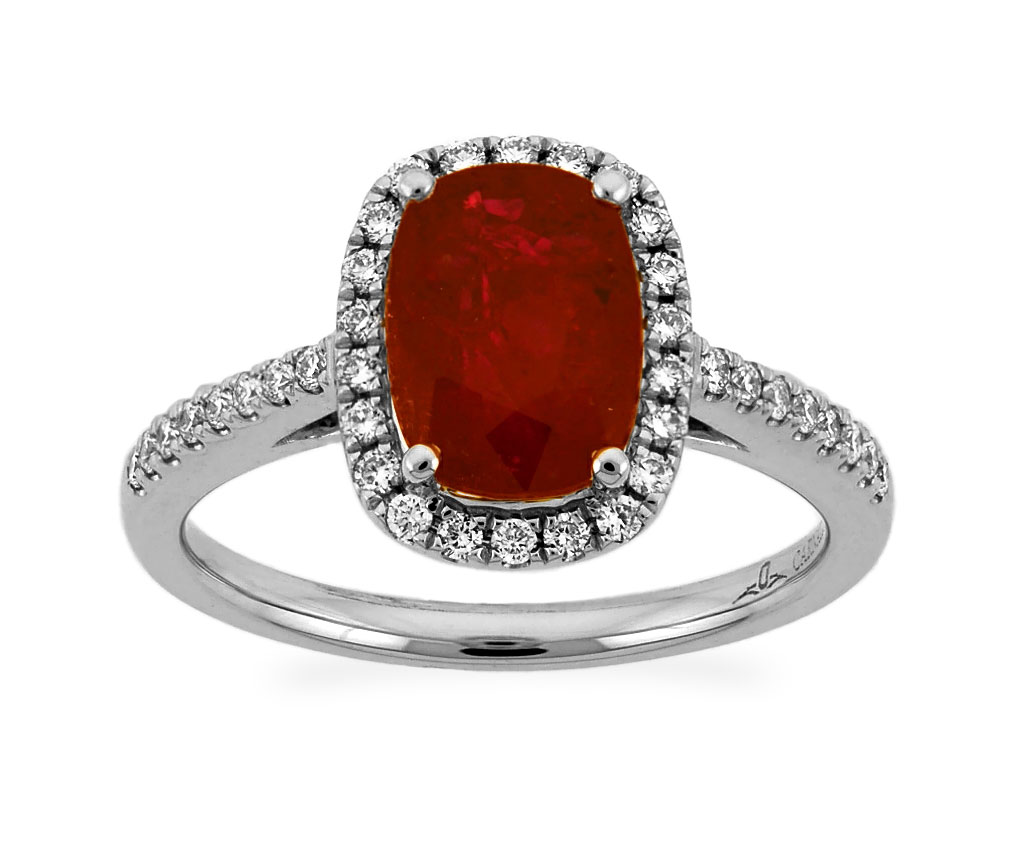 This stunning solitaire ring features the most radiant purplish red oval shaped cut ruby at center enclosed with small round cut brilliant diamonds pave set in 18k white gold. This ring is proficiently created by Carnation Designs and its Signature is on its shank. It will bring you to wear at any time with any wardrobe for your unique style.