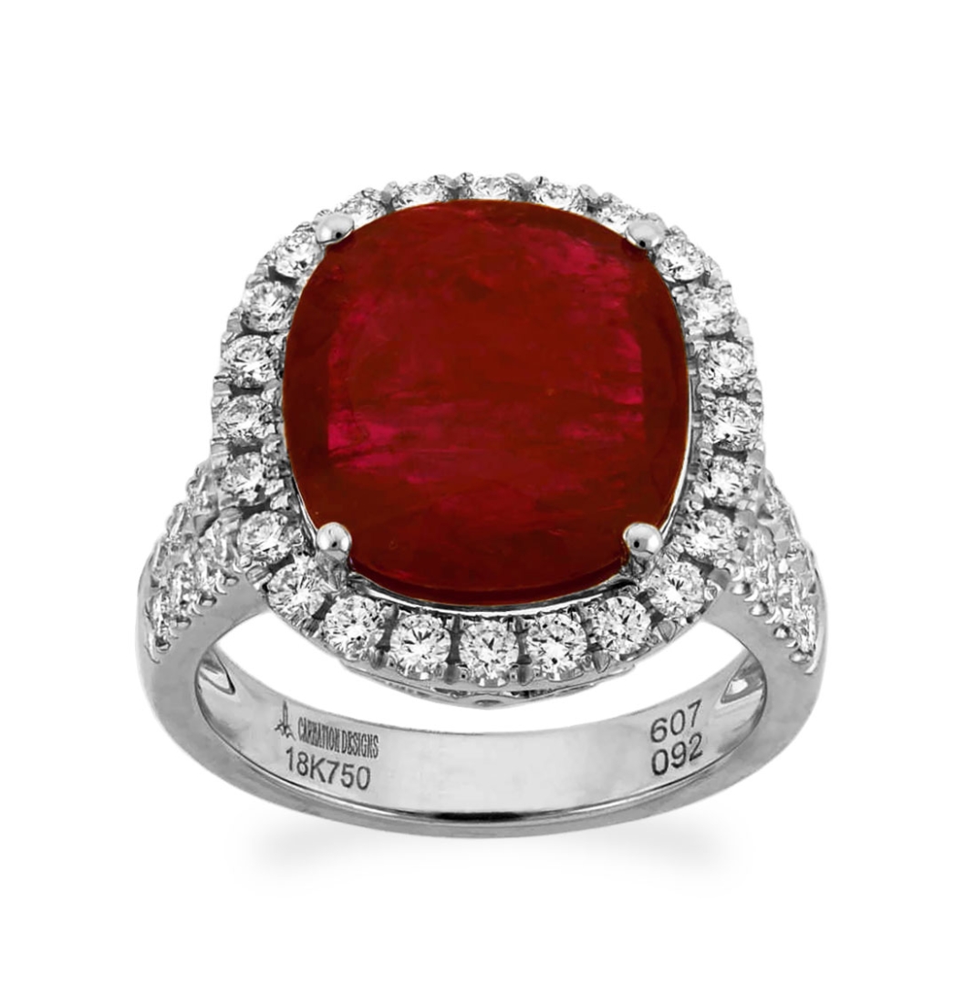 This gorgeous ring is made beautifully from Carnation Designs Signature. It features cushion shaped cut the most radiant purplish red ruby at center and the collection of same quality of small round shaped cut brilliant diamonds pave set. This 18k white gold fashionable ring will bring you to wear at any time with any wardrobe for your unique style.