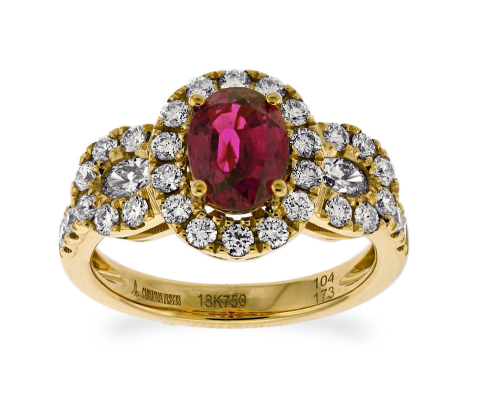 This stunning ring features one oval shaped cut the most radiant purplish red ruby in center with surrounding round-cut brilliant diamonds and one small oval shaped brilliant diamond accented on each side in 18k yellow gold band. This ring is beautifully created by Carnation Designs and its Signature is on its shank. It will bring you to wear your treasure forever!!!