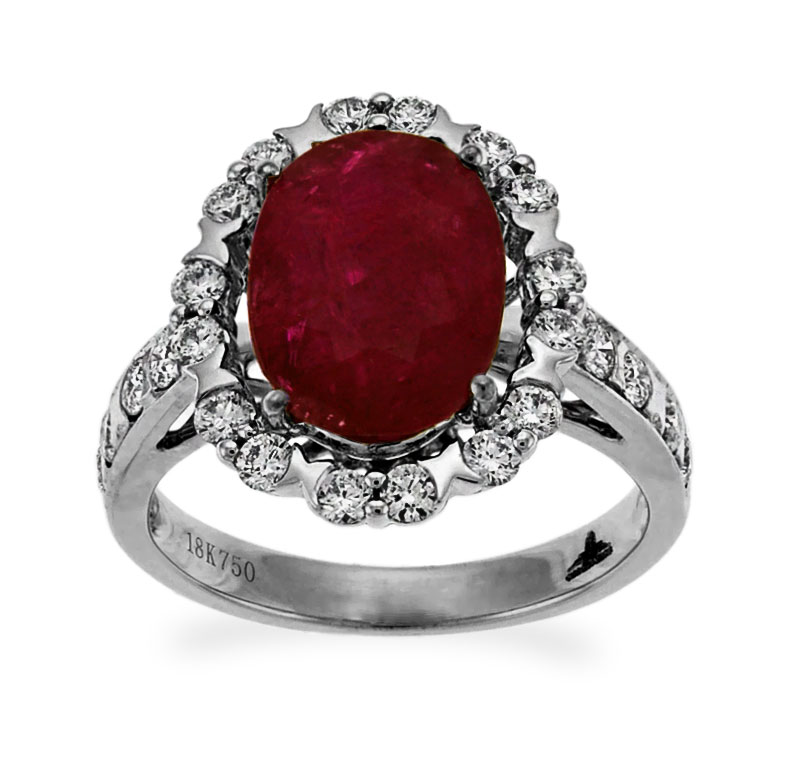 This gorgeous ring is made beautifully from Carnation Designs Signature. It features oval shaped cut the most radiant purplish red ruby at center and the collection of same quality of small round shaped cut brilliant diamonds pave set. This 18k white gold fashionable ring will bring you to wear at any time with any wardrobe for your unique style.