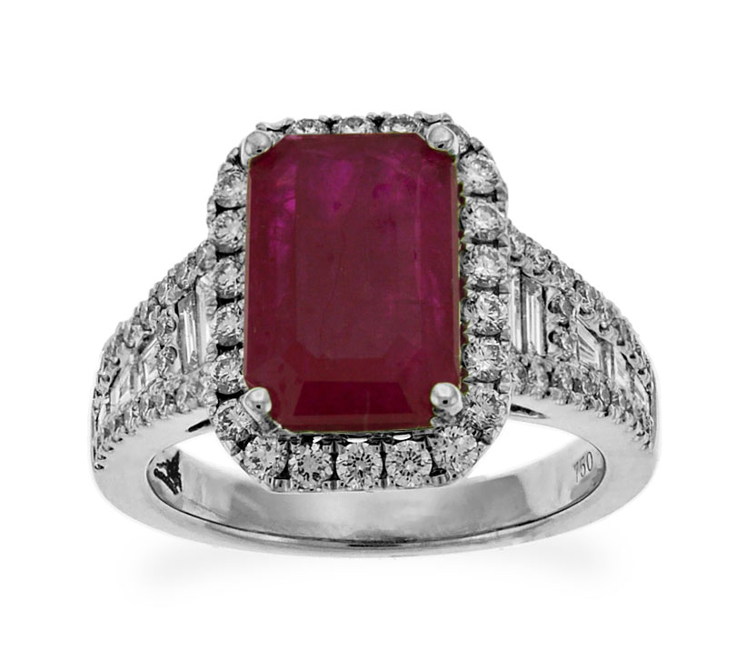 This gorgeous ring is made beautifully from Carnation Designs Signature. It features emerald shaped cut the most radiant purplish red ruby at center and the collection of same quality of small round cut brilliant diamonds pave set. This 18k white gold sophisticated ring is for any wardrobe to add your loveliness and you will love to wear it forever!!!
