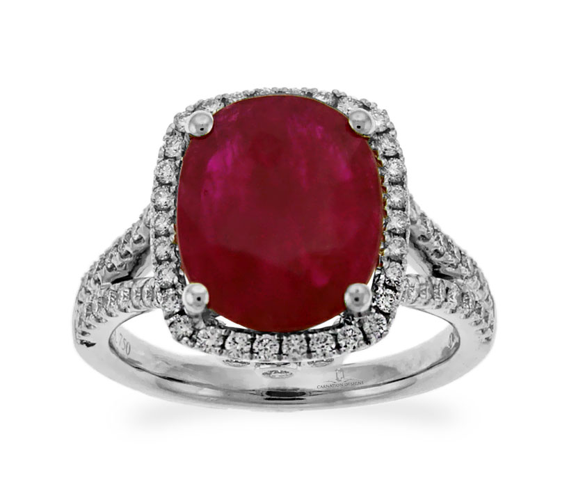 This gorgeous ring is made beautifully from Carnation Designs Signature. It features an oval shaped cut the most radiant purplish red ruby at center and the collection of same quality of small round shaped cut brilliant diamonds pave set. This 18k white gold fashionable ring will bring you to wear at any time with any wardrobe for your unique style.