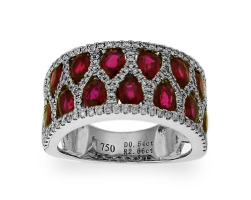This delightful ring features the same quality of round cut purplish red rubies accented by brilliant round-cut diamonds with pave-setting. Carnation Designs Signature is burnishing on its 18k white gold shank. It will bring you to wear any wardrobe at any time for a more glorious style.
