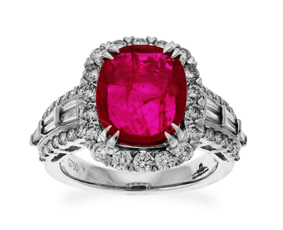 This gorgeous ring is made beautifully from Carnation Designs Signature. It features oval shaped cut the most radiant purplish red ruby at center and the collection of same quality of small baguette and round shaped cut brilliant diamonds pave set. This 18k white gold fashionable ring is for any wardrobe to add your loveliness and you will love to wear it forever!!!