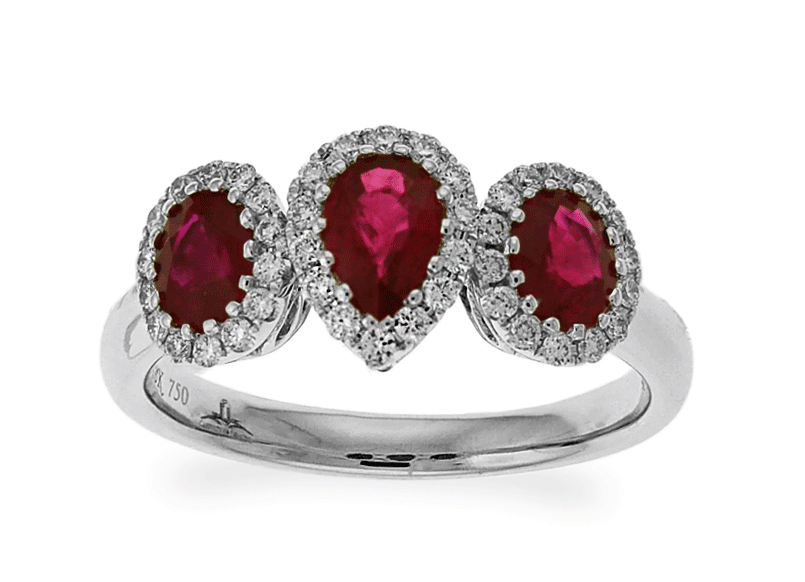 This gorgeous three stones rubies ring features one pear shaped cut purplish red ruby at center with surrounding round-cut brilliant diamonds and one oval shaped cut the most radiant purplish red ruby accented on each side in 18k white gold band. This ring is beautifully created by Carnation Designs and its Signature is on its shank. It will bring you to wear your treasure forever!!!