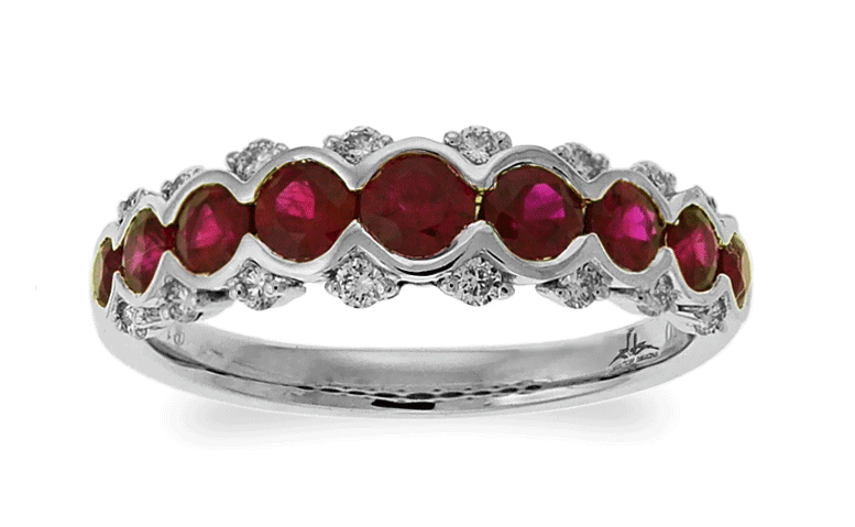 Carnation Designs Signature ring features nine round shaped cut purplish red rubies surrounded by small round cut brilliant diamonds pave-setting. This beautiful 18k white gold ring is perfectly matched to wear at any time with any wardrobe. You will love to wear it for a more glorious style.