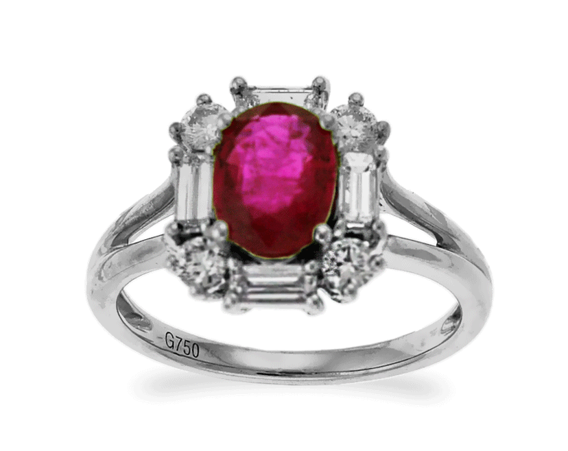 This gorgeous ring is made beautifully from Carnation Designs Signature. It features the oval shaped cut the most radiant purplish red ruby at center and the collection of same quality of baguette and small round shaped cut brilliant diamonds pave set. This 18k white gold fashionable ring will bring you to wear at any time with any wardrobe for your unique style.